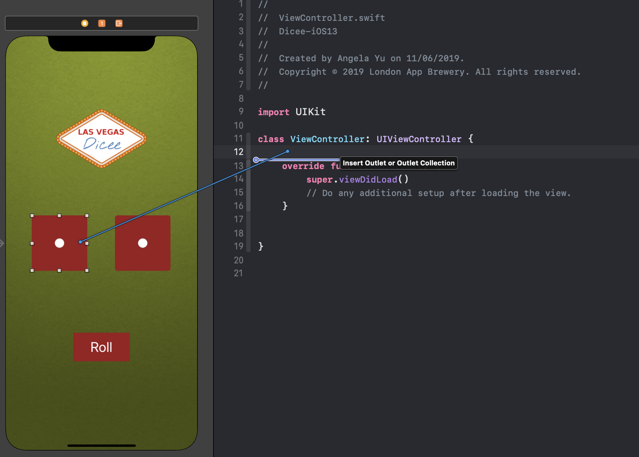 ctrl을 누른 채 UI 요소를 코드 상 원하는 위치로 드래그 → IBOutlet이 생성됨